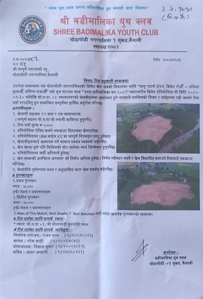 घोडाघोडी २१ पुष (कैलाली) — घोडाघोडी नगरपालिकामा क्रिकेट खेल क्षेत्रको विकास गर्ने उद्देश्यका साथ बडीमालिका युथ क्लब ले “लागू पदार्थ होइन, क्रिकेट रोजौँ– प्रतिभा फुलाऔँ, भविष्य सजाऔँ” भन्ने मूल नारासहित प्रथम बडीमालिका कप २०८२ नगरस्तरीय क्रिकेट प्रतियोगिता आयोजना गर्ने भएको छ।