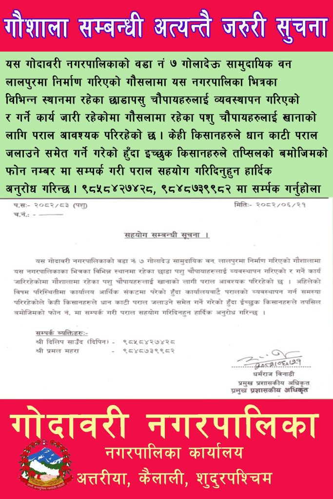 श्री दुर्गा भवानी माध्यमिक विद्यालय, गो.न.पा. वडा नं. ७ बाट १ थान टेबल र १ थान स्टिल दराज श्री पृथ्वीनगर आमा समूह, गो.न.पा. वडा नं. १ बाट १ थान कम्प्युटर टेबल र १ थान घुम्ने कुर्सी श्री सृजनशील महिला विकास बहुउद्देश्यीय सहकारी संस्था लि., गो.न.पा. वडा नं. ८ बाट १ थान रङ्गीन प्रिन्टरयस महत्वपूर्ण सहयोगका लागि गोदावरी नगरपालिकाले सबै सहयोगी संघसंस्थाप्रति हार्दिक आभार प्रकट गरेको छ।
